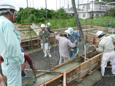 より良いコンクリートを目指し、スランプ12の硬めのコンクリートで打設を行いました。
